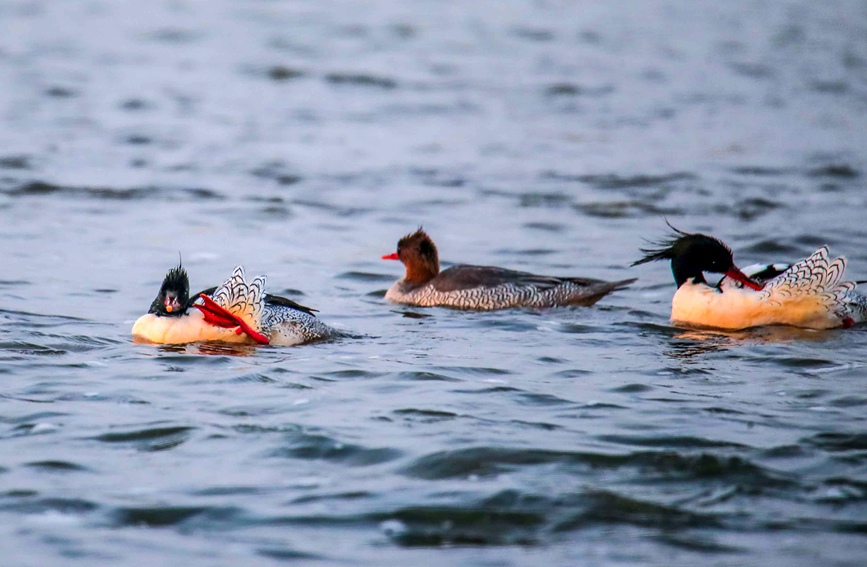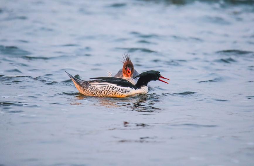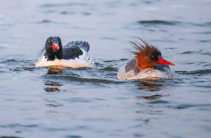 中华秋沙鸭和赤麻鸭等众多鸟类,在碧波中嬉戏、觅食。聂金锋摄