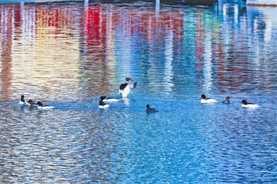 2月24日,榆林城区榆溪河内数十只秋沙鸭正在嬉戏。