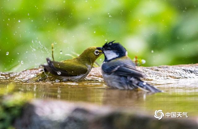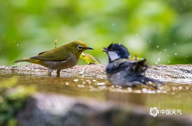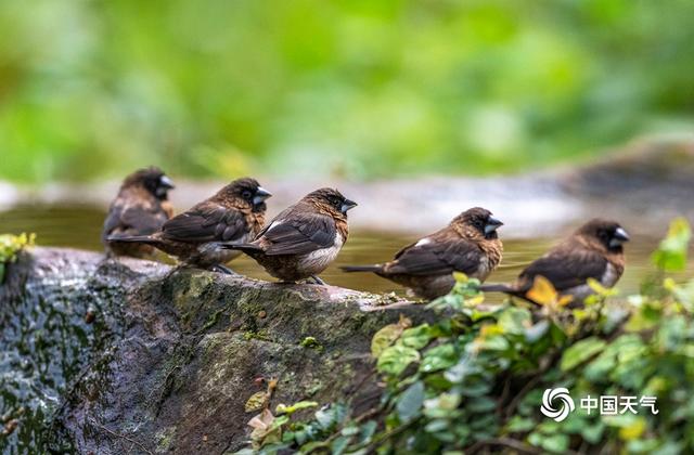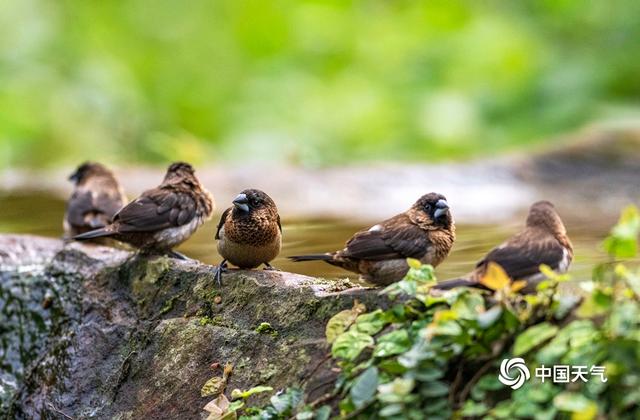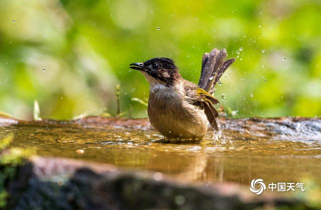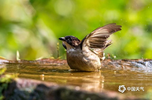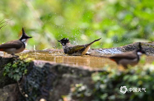 中国天气网讯 春回大地,暖风徐徐,近日,广西南宁青秀山风景区一处浅水坑,每天都招来许多小鸟,鸟儿们在水坑里欢快地饮水、嬉戏、或在暖阳下沐浴清洗羽毛,场面灵动而和谐。图为3月2日拍摄。(文/黄丽娜 图/曾海科)