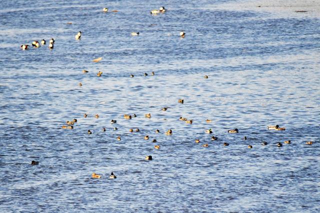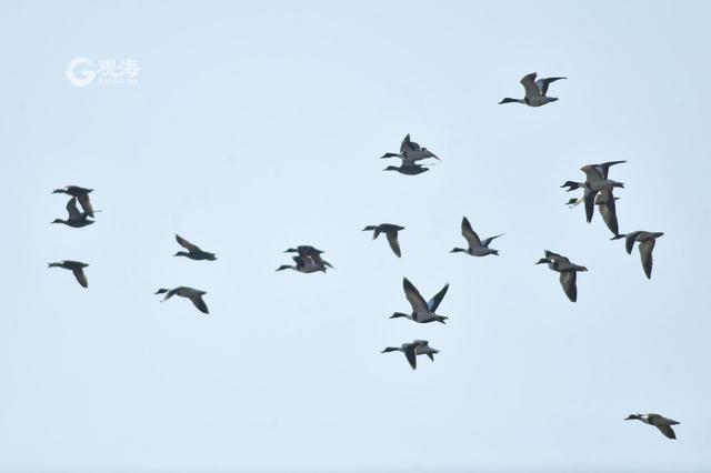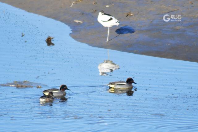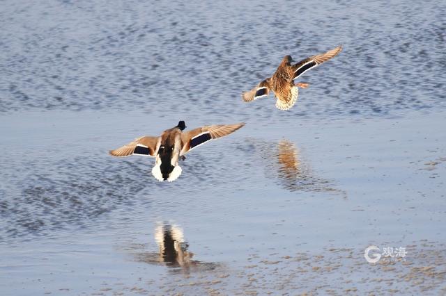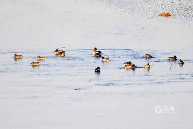 春日时节,在青岛市城阳区流亭街道墨水河入海口湿地,成群野鸭或觅食或嬉戏,乐享春光。