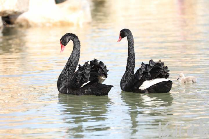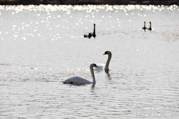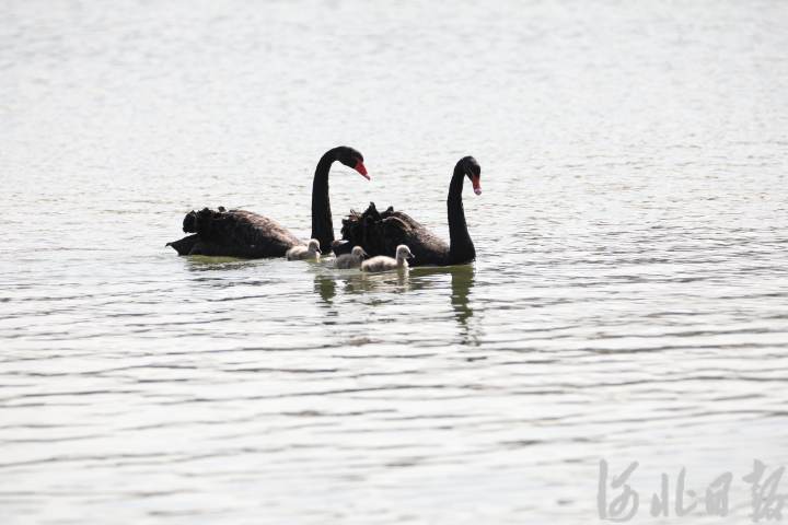 近日,广平县天鹅湖湿地公园内,天鹅在湖面嬉戏。