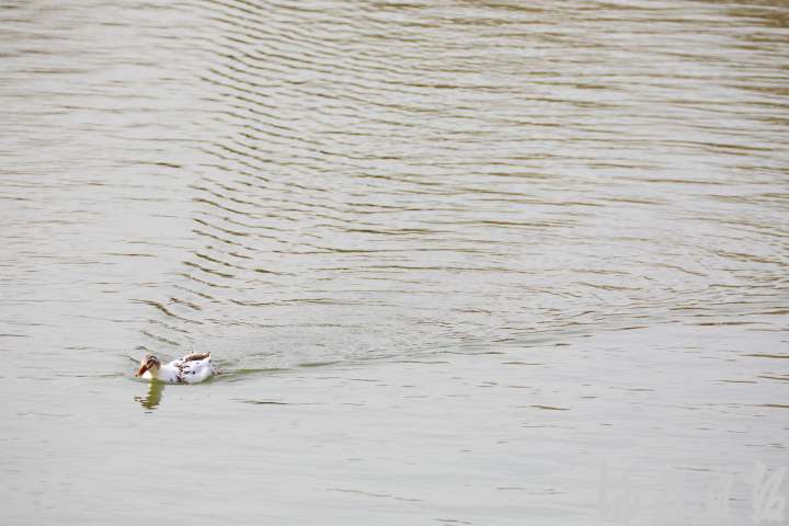近日,广平县天鹅湖湿地公园内,野鸭在湖面游弋。