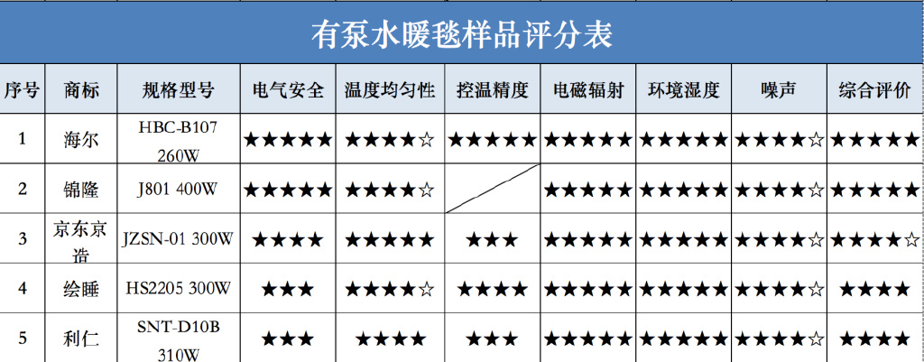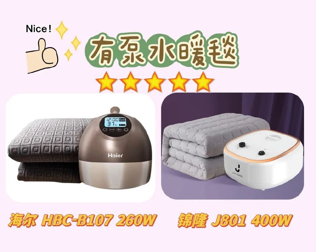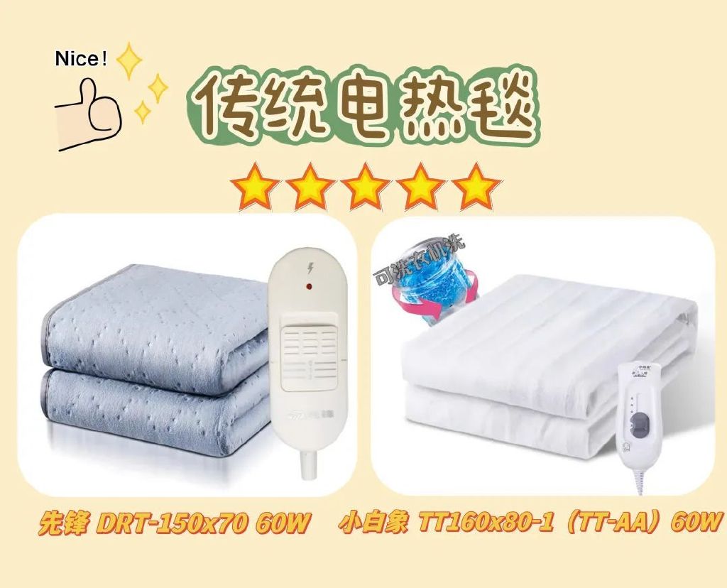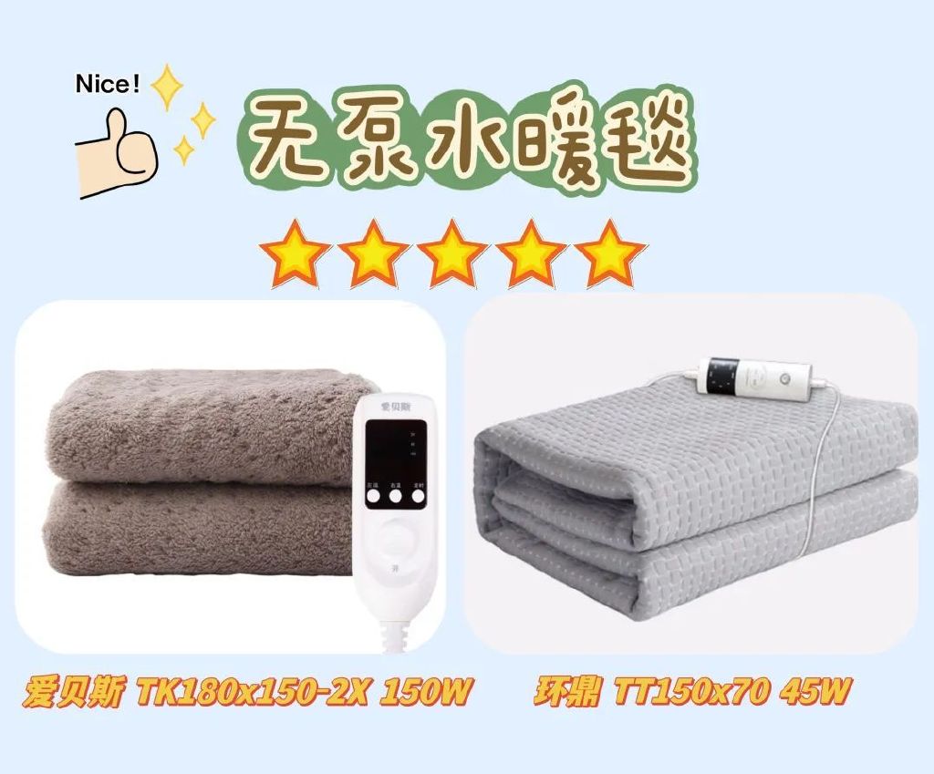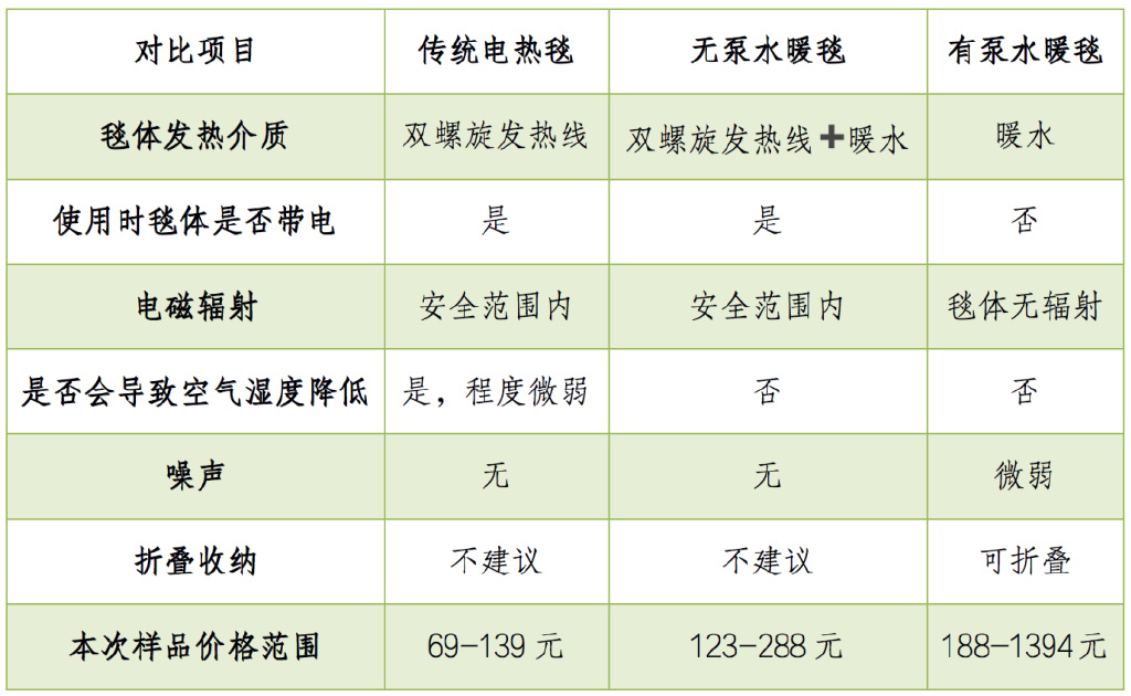 5、综合结果综合来看,不同类型的电热毯各具特色:传统电热毯操作简单,价格实惠;无泵水暖毯不会加剧空气干燥,价格适中;有泵水暖毯毯体不带电、无辐射,“保湿”性能更好,主机智能化程度高,价格普遍较高。