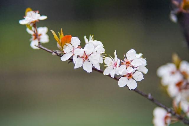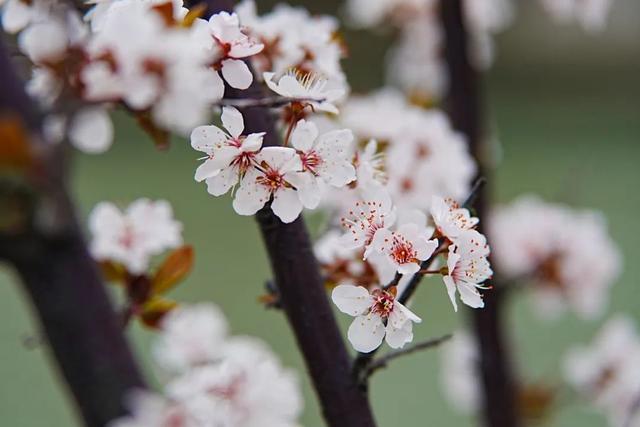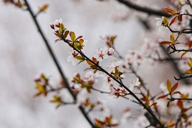 沿着园区内蜿蜒的河流行走,常能见到紫叶李的身影。远观,它们宛如一片粉紫色的云雾,走近细看,才发现原来有簇簇白色的小花缀于枝头,花间还有一片片小小的紫色叶子,使得整棵树浸染上了一种不同寻常的色彩。