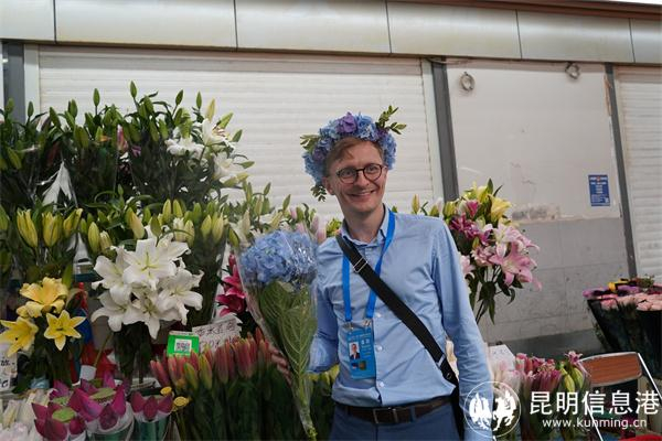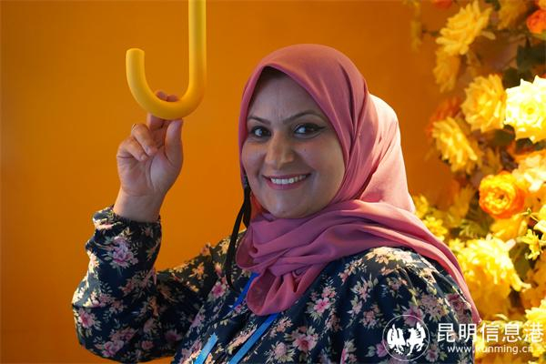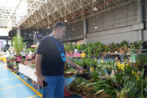 突尼斯非洲之音电台总监莱拉·阿提阿拉在花卉展览馆拍照。“当我踏入市场的第一秒——无数种花卉的芬芳瞬间涌来,它们在空气中交织成一场强大而美丽的感官盛宴,这种震撼我将终生铭记。”突尼斯非洲之音电台总监莱拉·阿提阿拉激动地说,“我也为自己买了一束花!它们不仅是纪念品,更是昆明的鲜活记忆。”