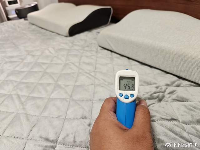 那么水暖毯较远的头和脚温度如何呢?在床体另一侧表面测量头部温度为45.9。