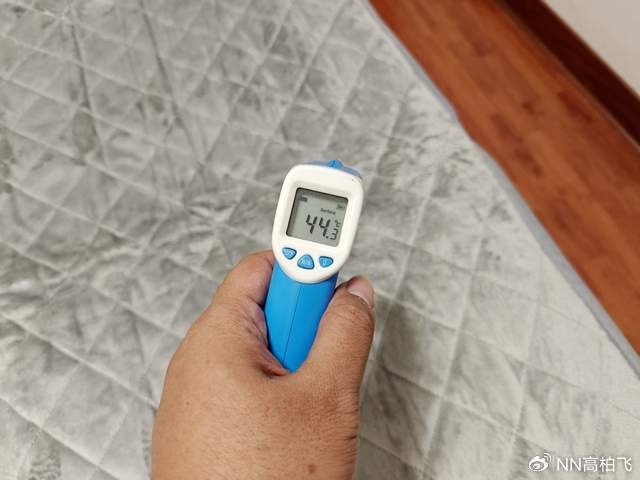 3-5分钟再用红外温度检测仪测量温度为43.3,可见水暖毯的升温速度还是非常快的。