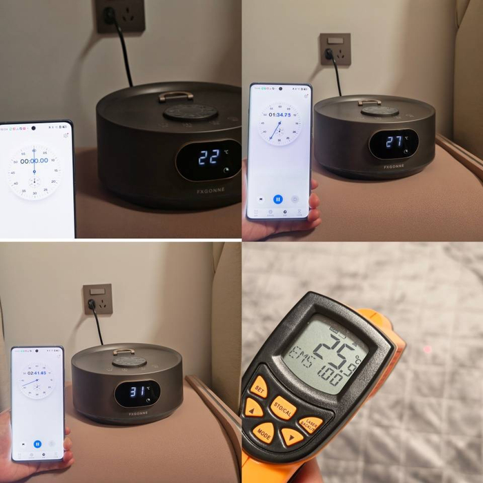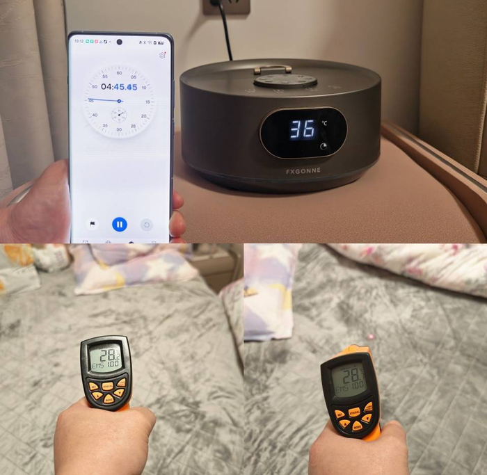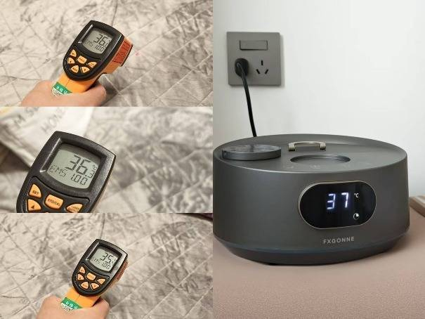 将温度设定在37℃后启动计时。2分钟以后温度从室温22℃升至31℃,被窝温度测试显示25℃左右。4分钟左右温度升至36℃,被窝温度温度已升至28℃;10分钟以后,被窝温度已经达到了35~36℃!这样的速度,即便是寒冬深夜起夜,回来也能即刻拥抱温暖。