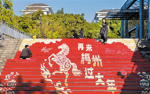 - 院士广场有人在阶梯上作画,路过的行人与这抹红撞个满怀,拾阶鸿运,马上 “梅”好。