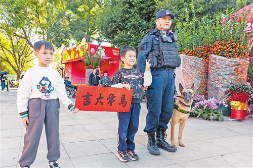 - 花市上,放寒假的小朋友举着 “马年大吉” 的祝福,与特警、警犬定格下开怀瞬间。守护万家,万家安详,是最美“警”色。