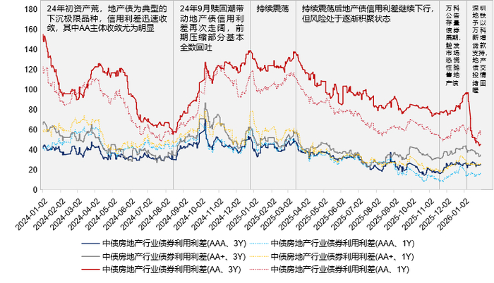 数据来源:iFinD,经浙商银行整理如上图所示,针对房企还款能力的悲观预期同样对一级市场发行构成扰动,自22WKMTN004未能及时兑付当日起,一级市场地产债发行已受到冲击,2025-12-15至2026-01-09一级地产债迅速转向高估值发行为主,其中信达地产拟发行的MTN受市场大幅波动影响取消发行,但城投属性涉房主体受到影响相对有限。该情况一直持续到2026年1月9日,以3Y的26保利置业MTN001低估值25bp左右发出为典例,地产债一级市场发行开始回暖,以兴泰控股、苏高新低估值15bp附近发出为例,1月最后一周认购情绪回升相对明显。