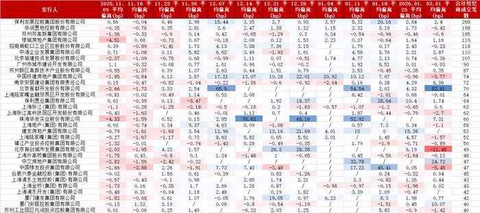 从二级市场视角出发,2025.11.26WK公告拟针对“22 WK MTN004”展期相关事项召开持有人会议,对地产债二级交投情绪造成较大扰动,导致地产债估值中枢普遍上行。在公告后的三周内,地产债二级成交偏离度同样显著抬升,典型如保利发展、首开、建发等。本文摘取2025.11.9以来,二级地产债经纪商成交数据,剔除笔数在40笔以下的部分,逐周整理得到各地产主体周度平均成交偏离数据如下: